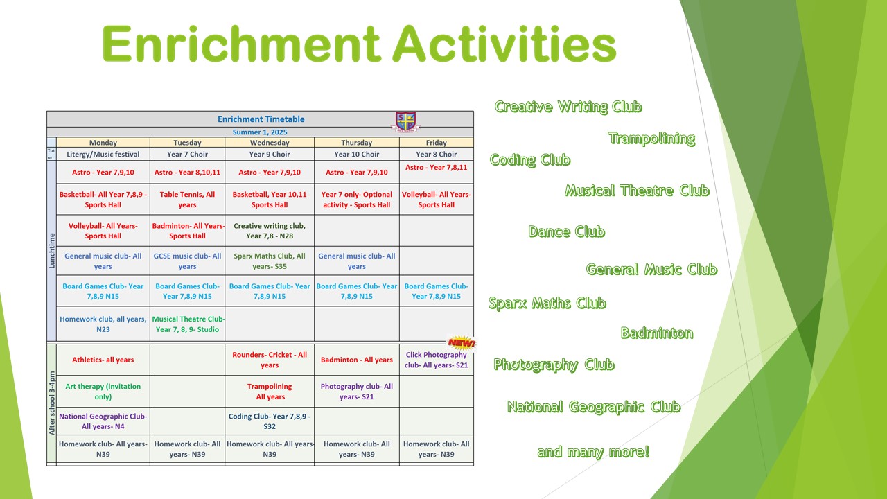 Here are details of the activities offered in our Enrichment Programme for students to enjoy this term.