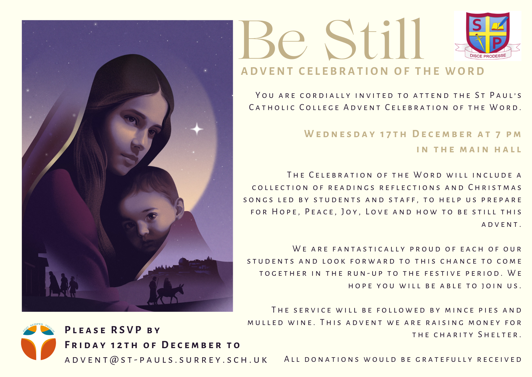 St Paul's Catholic College would like to invite you to this year's Advent Celebration of the Word which will be held on Wednesday 17th December at 7.00 pm in the Main Hall.