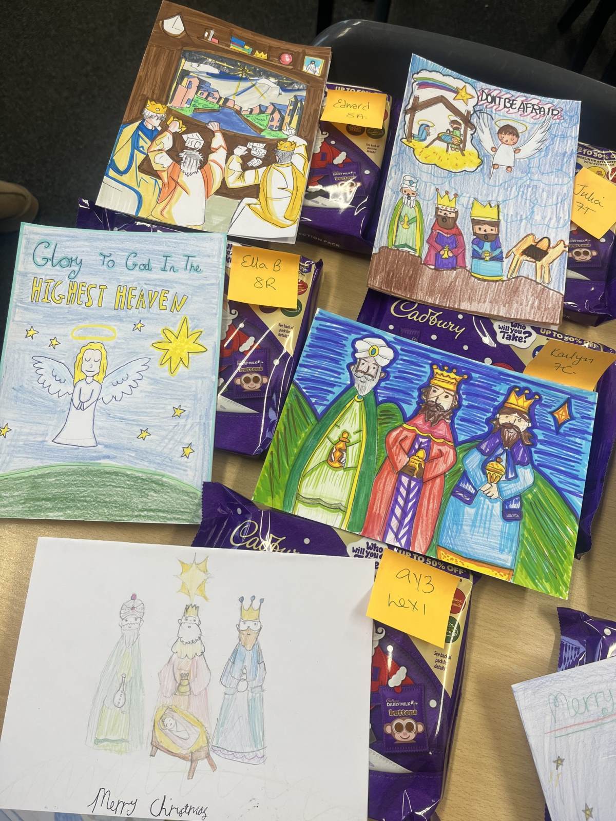 The RE Department hosted a Christmas Card competition this year, inviting KS3 students to design cards based on the theme of Luke 2:8-15. Miss Delahunty and Miss Mendoza selected individual winners from each class and have submitted their entries to the Diocese competition, hoping for some exciting winning announcements in the New Year. Well done to all KS3 students – the cards they created were fabulous.