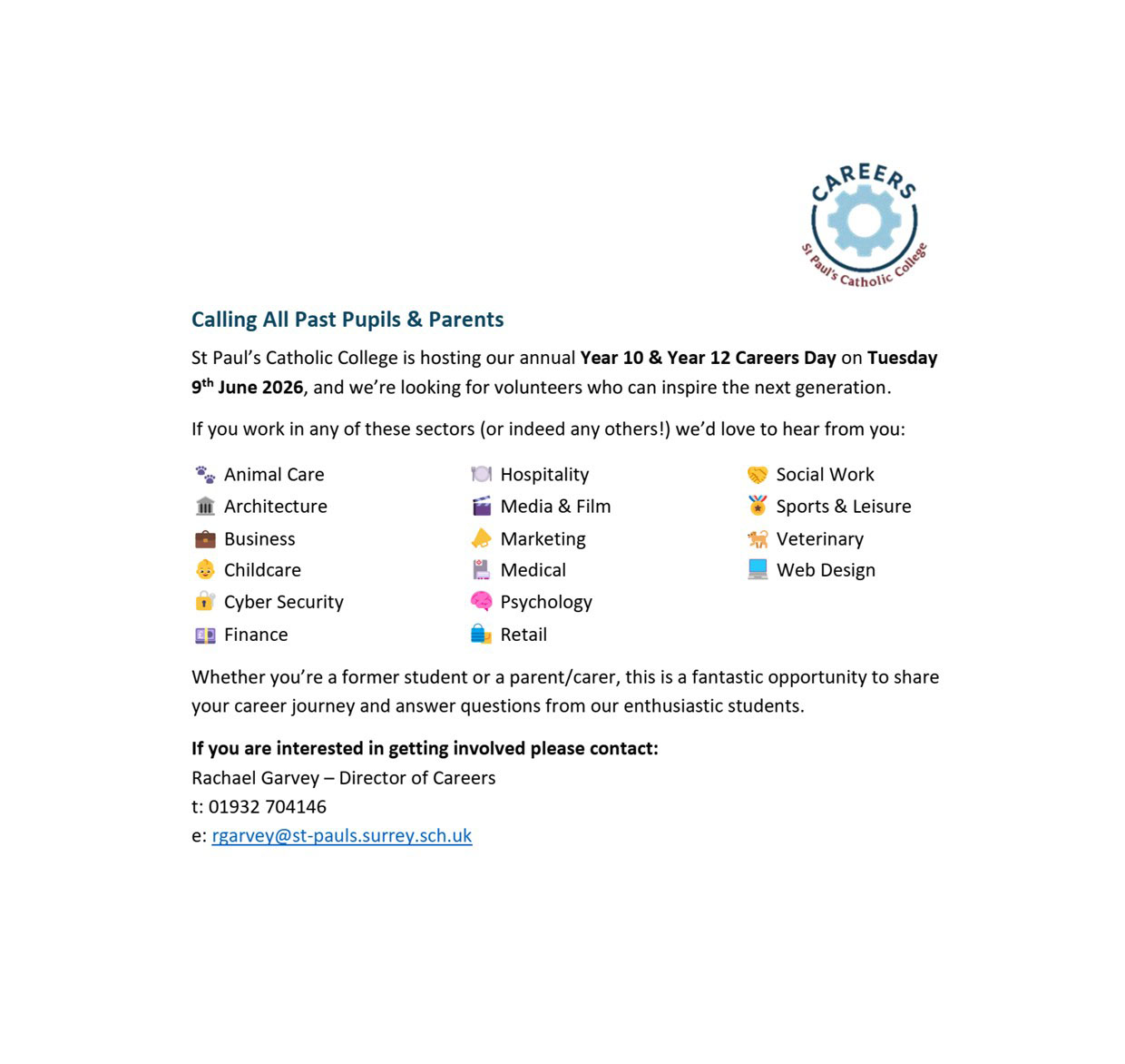 St Paul's Catholic College is hosting its annual Year 10 and Year 12 Careers Day on Tuesday 9th June, and we are looking for volunteers to inspire the next generation. Can you help?