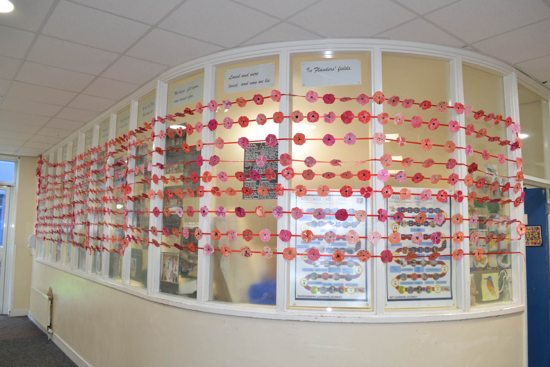 In honour of Remembrance Day, art students from all year groups collaborated to create this stunning poppy display. Each student crafted a unique poppy inspired by the powerful words in the poem 'In Flanders Fields' by John McCrae. Students were asked to discuss with their families if any of their family members had served in any conflict across the world so that they could add their names to their poppies and share stories in class. Over the past week, we have heard stories of incredible bravery and commitment. The children are quite rightly incredibly proud of their family members, from great grandparents who survived the holocaust in concentration camps, to aunts and uncles currently serving in Ukraine and around the world.